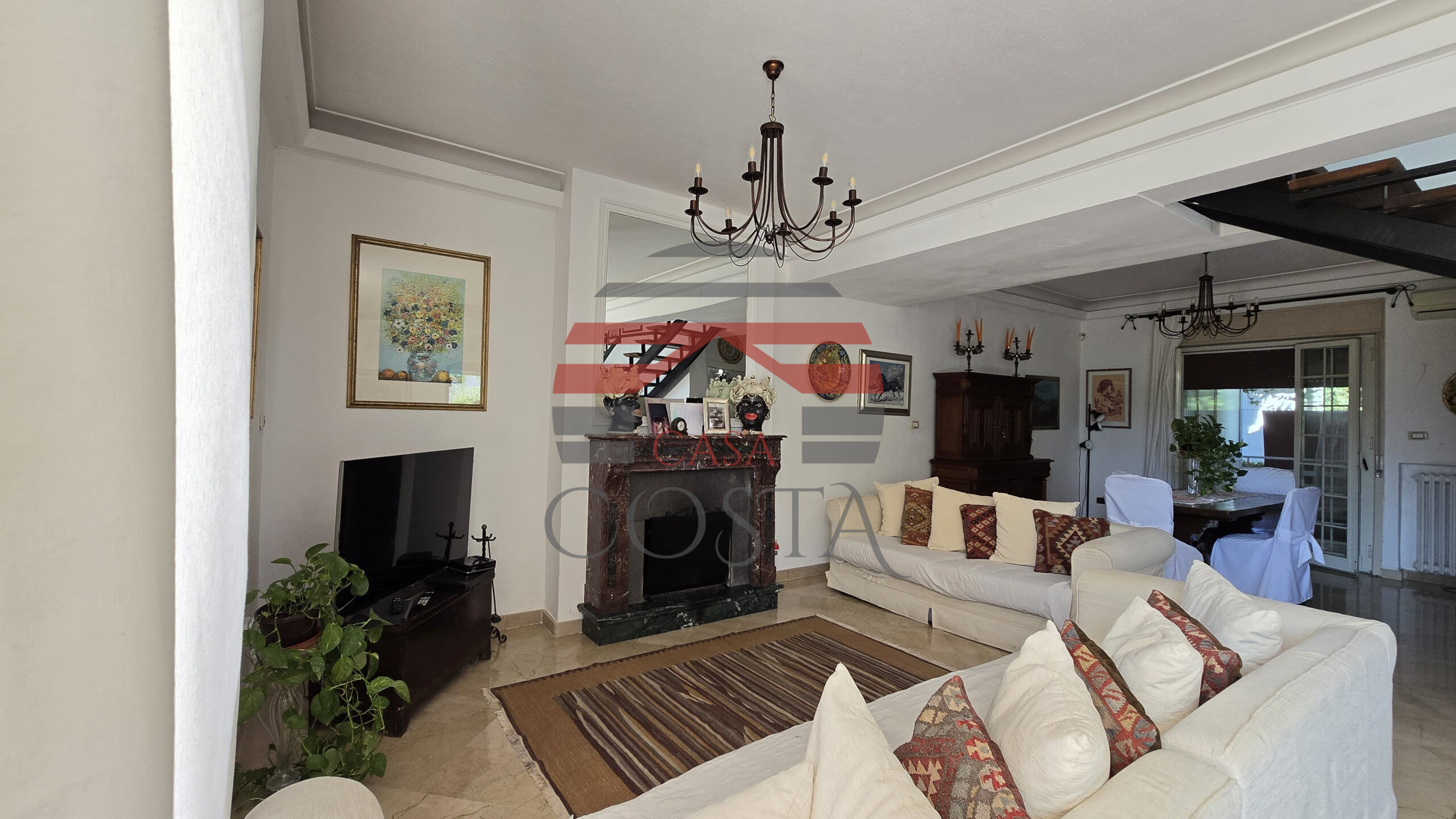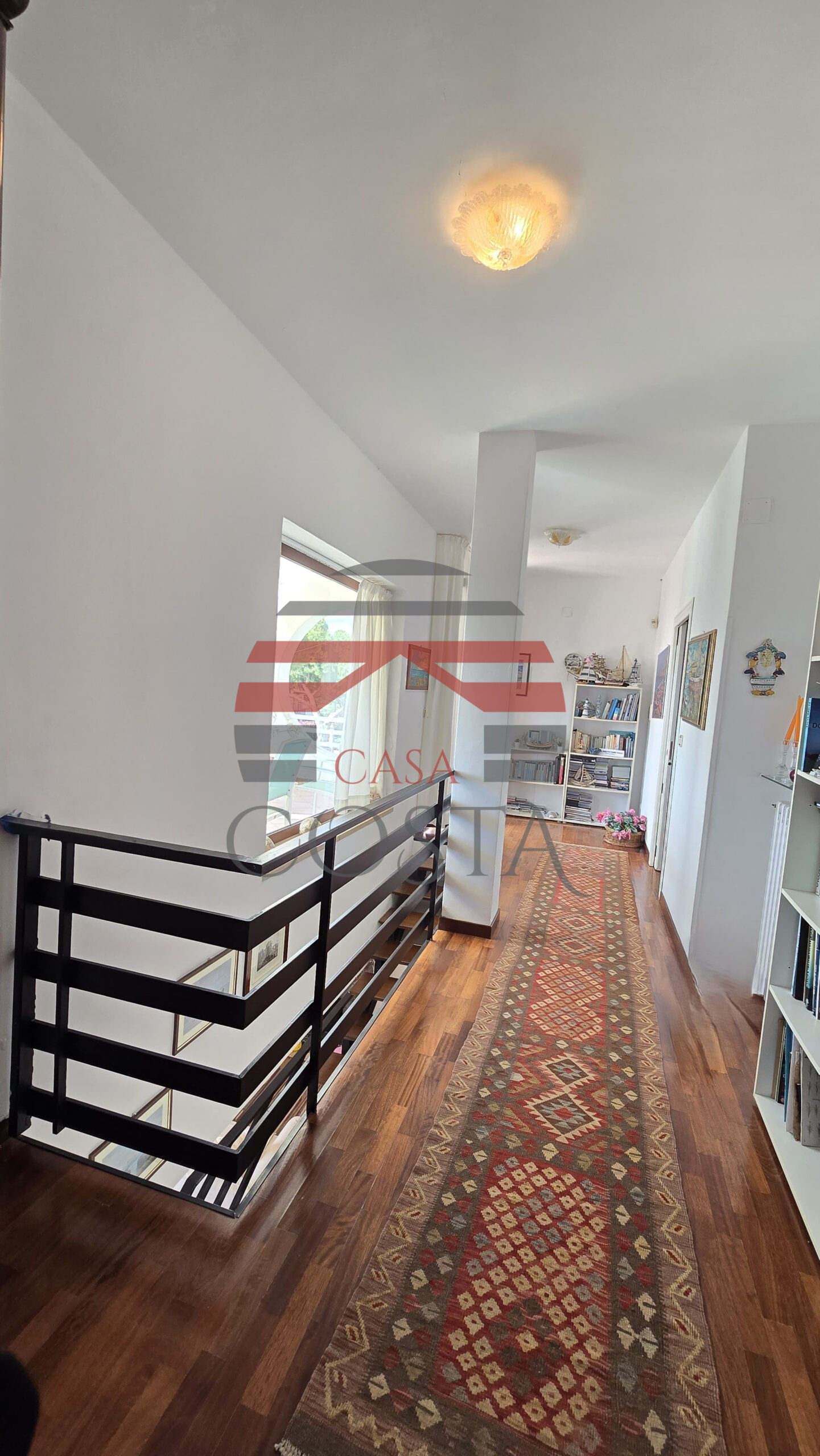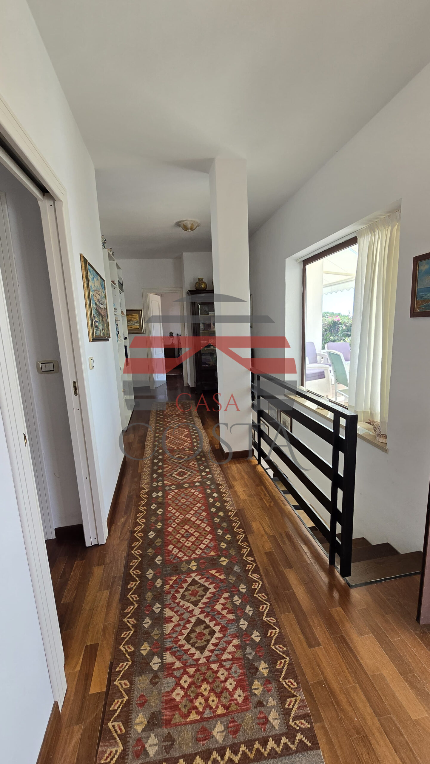 Il piano primo è composto da ingresso su disimpegno, salone doppio con camino e terrazza a prospetto, cucina abitabile, wcd, altra terrazza con barbecue e piante ornamentali;